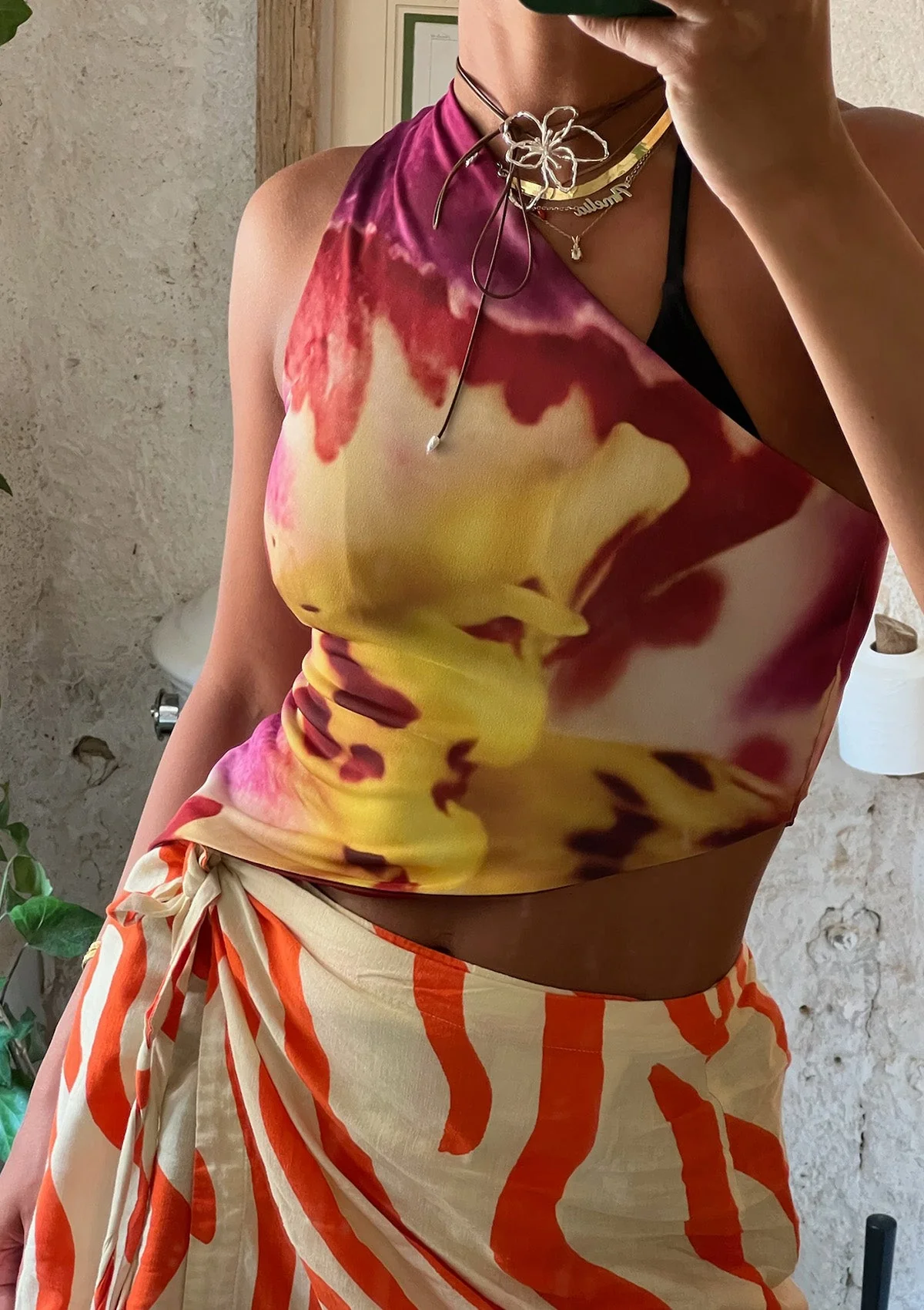 Embrace individuality with this distinctive top, featuring an asymmetrical silhouette and a custom print that sets it apart in your wardrobe.