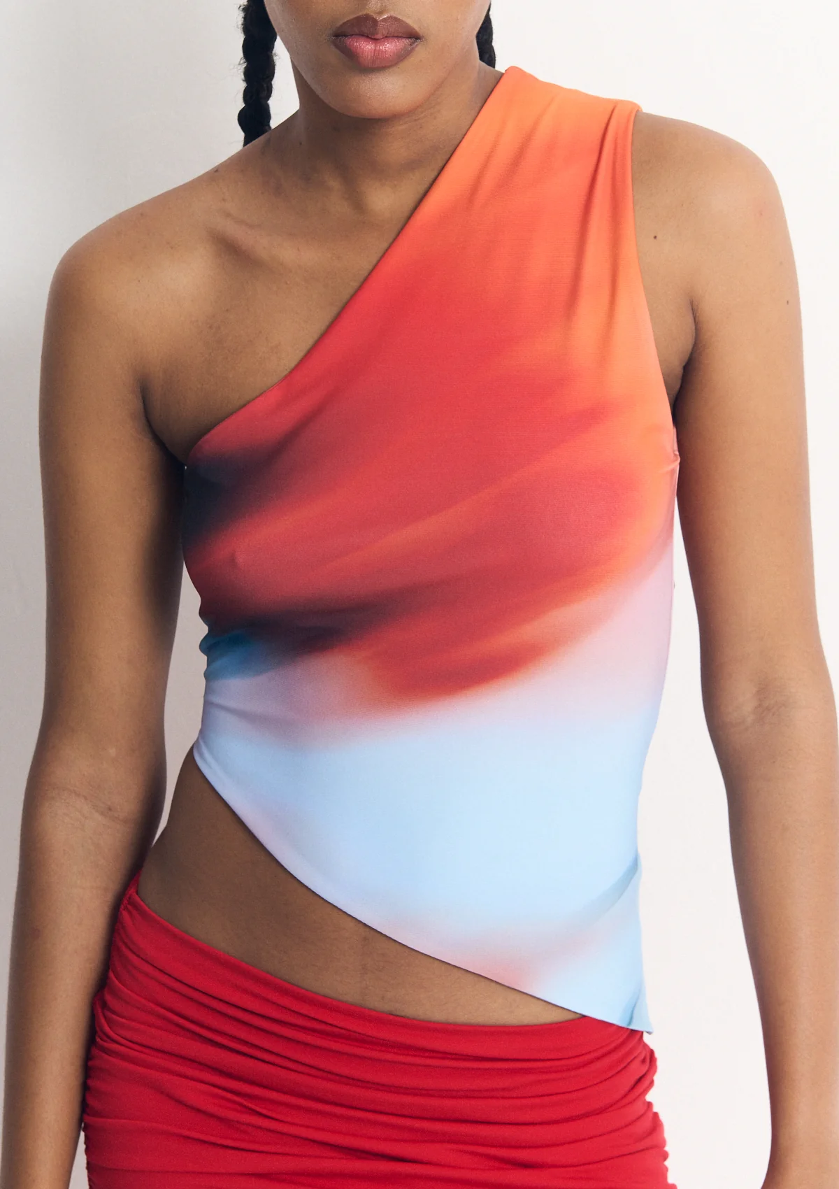 Embrace individuality with this distinctive top, featuring an asymmetrical silhouette and a custom print that sets it apart in your wardrobe.